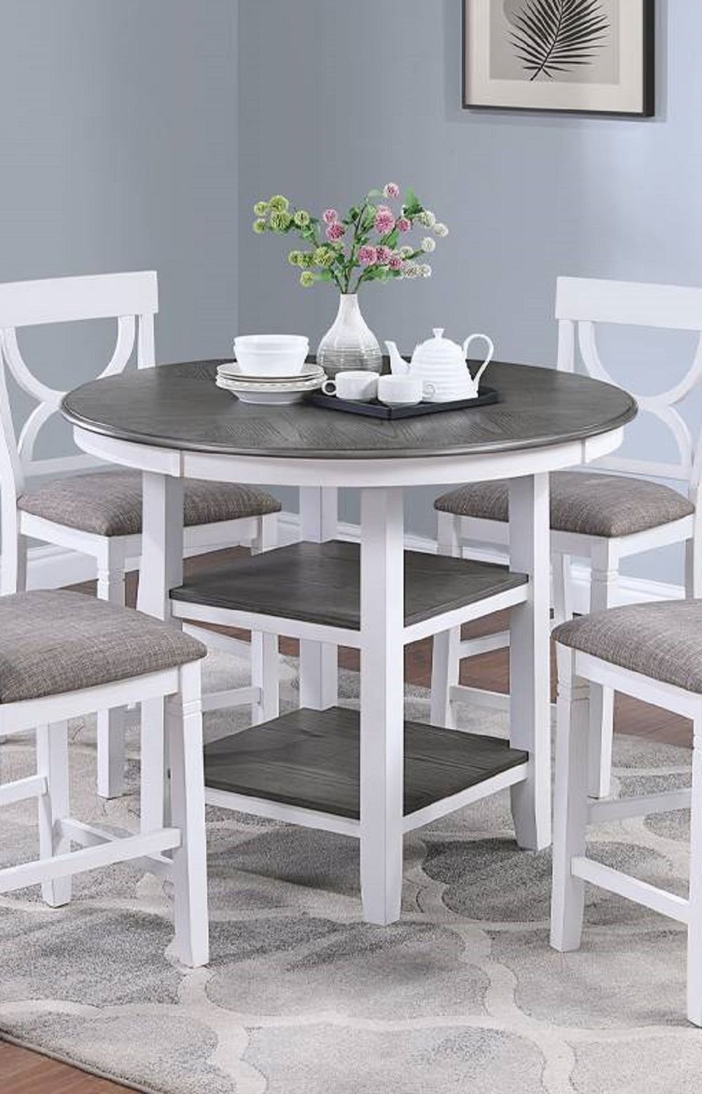 Product Description:Enjoy your meals with this 5-piece Counter Height Dining set, which comes with 4 matching Dining Chairs, featuring nicely padded seats, an attractive curve-back chair design, and a footstool bar. The Dining Table features a gracefully rounded table oak veneer finish with decorative and functional shelves. Available in different colors.Product Features:Contemporary StyleWhite Finish, Oak VeneerRubber WoodMDF + Oak VeneerUpholstered Cushion SeatUnique BackStorage Shelves Table BottomProduct Dimension:Dining Table: 42" DIA x 36"H High Chairs - 18: x 21" x 41"H; 24" H SeatListing Include: 5pc Dining Set (Counter Height Dining Table and 4x High Chairs) Only.Simple Assembly Required.