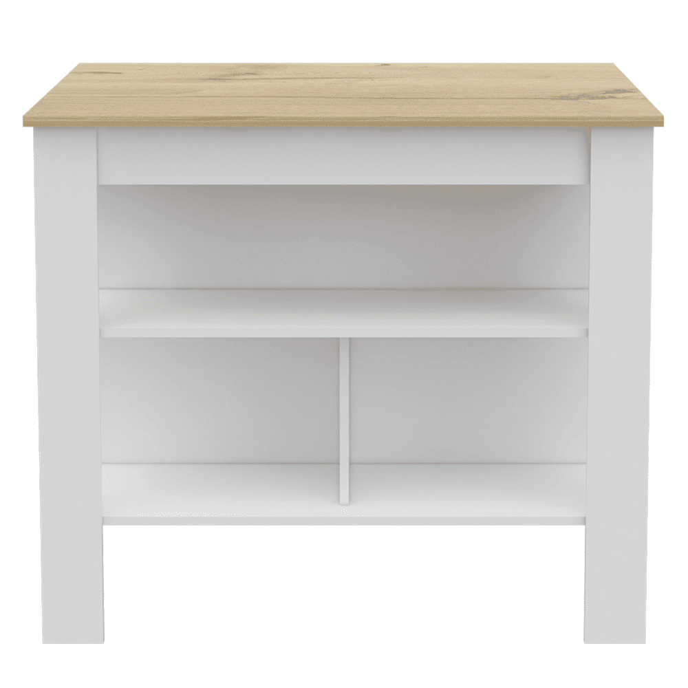 Kitchen Island features three wide low shelves perfect for storing all your kitchen items
