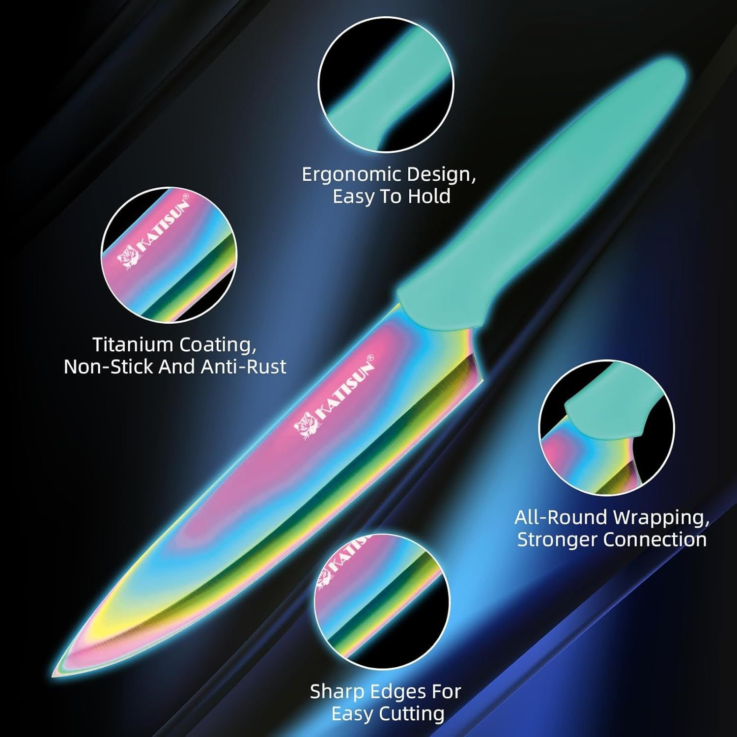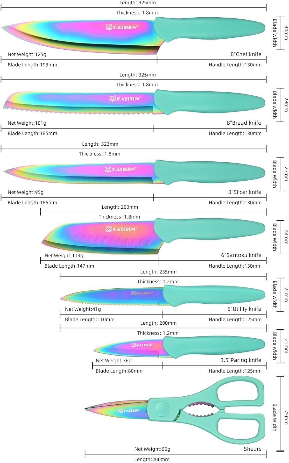 13 Piece Rainbow Tatinium Coating Stainless Steel Boxed Knives Set, Anti-Rust and Dishwasher Safe, 6 Knives with 6 Blade Covers and one Kitchen Shear