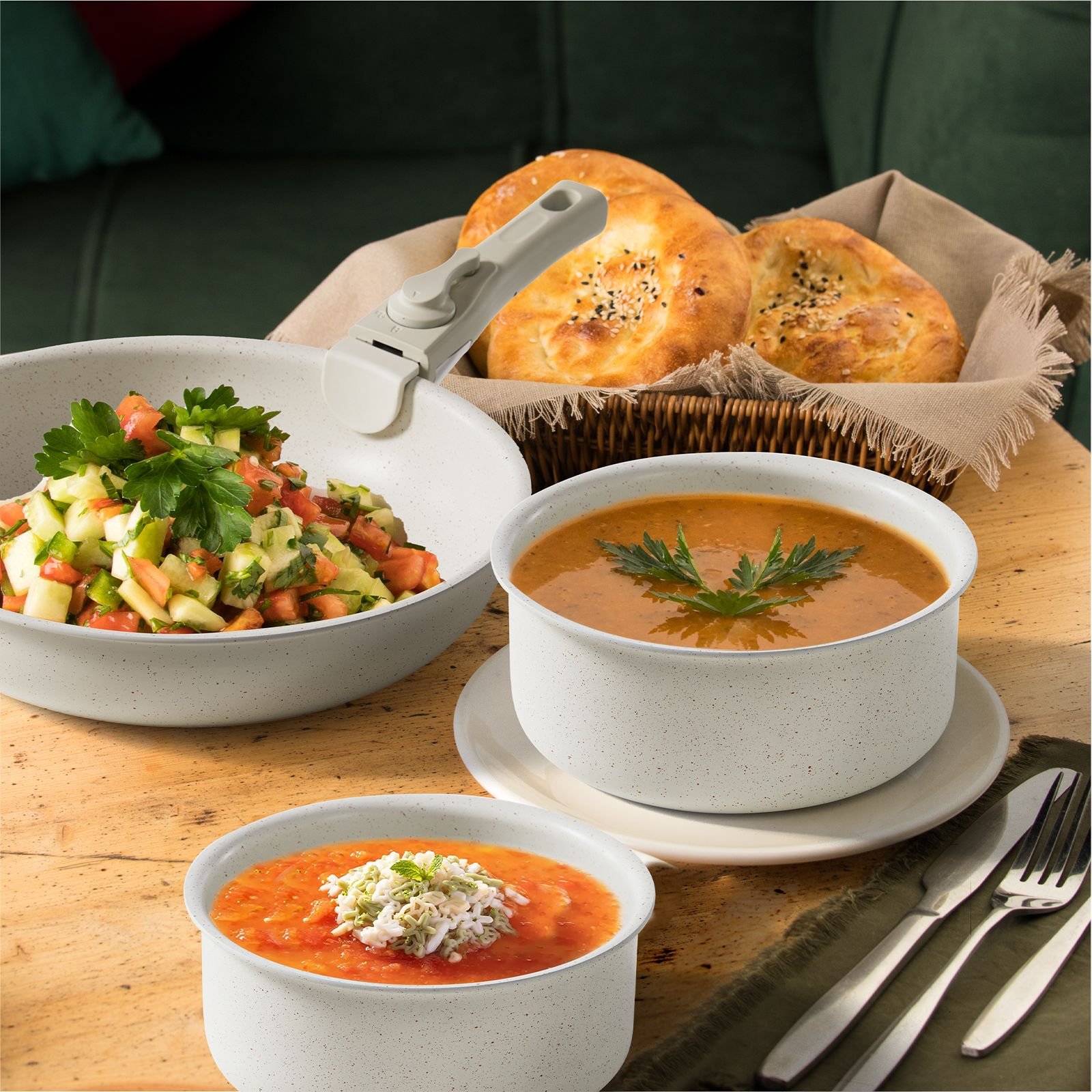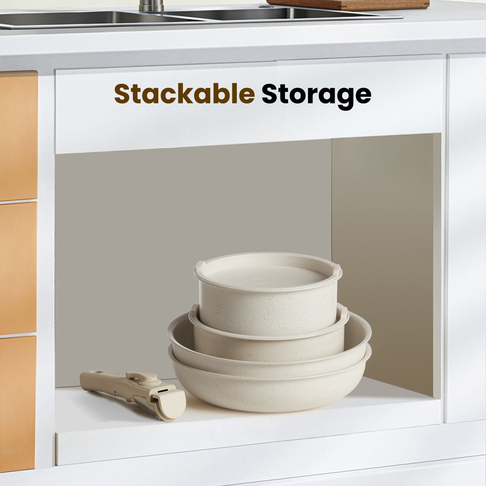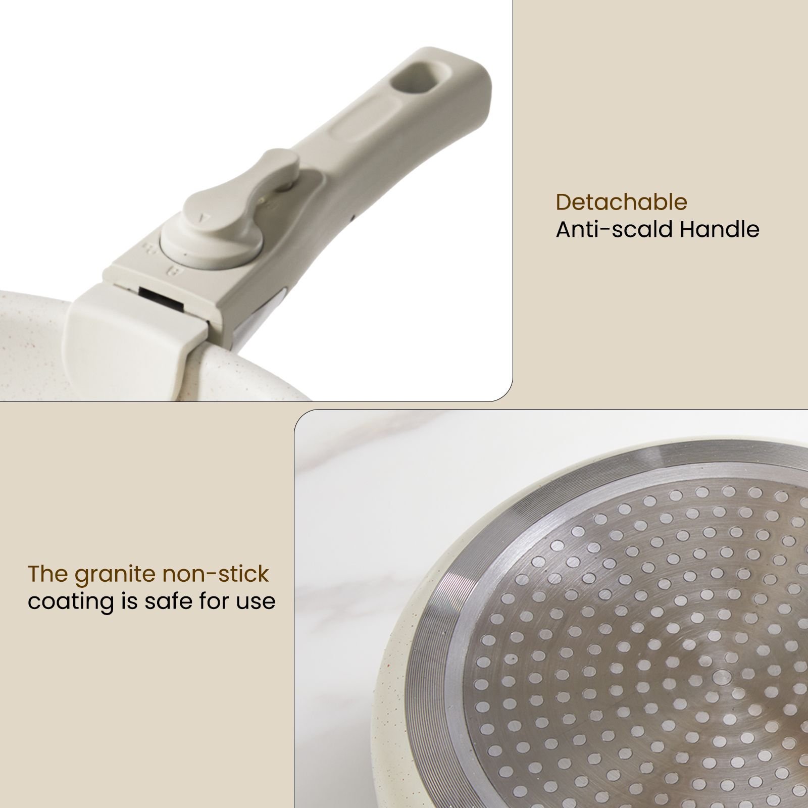 Made with non-stick granite, the cookware set promises easy and effortless cleaning. The unique granite material prevents food from sticking to the surface, reducing the need for oil and making your meals healthier and clean-up faster.This cookware set features detachable handles, perfectly designed to handle hot pots and pans safely. The unique design allows for easy and secure handling while cooking, ensuring you a hassle-free cooking experience.All items in this cookware set are dishwasher-safe and suitable for all types of stovetops. Easy to clean and versatile, it promotes convenience in your day-to-day cooking. Upgrade your kitchen with this premium cookware set, designed for longevity and performance.The granite non-stick coating is safe for use. It is free from potentially harmful chemicals, ensuring your meals won't be contaminated by any unwanted substances. Experience worry-free cooking with our safe and high-quality cookware set.The pots, pans and detachable handles of this cookware set are stackable, saving you valuable kitchen space. Ideal for small kitchens or for those looking to optimize their storage area.