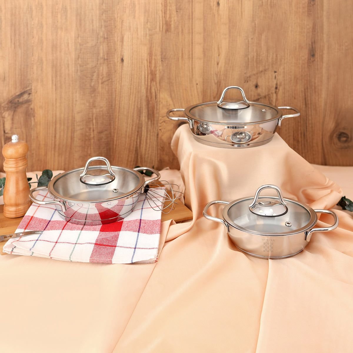 DIMENSIONS: 6 piece pan set includes 5", 6" and 7" omelette pan with tight-fitting glass lids. Please note: lids are counted as individual pieces. Tempered glass lids lock in true flavor and nutrients for tender, succulent dishes while the body-extension steel handles offer a safe and secure hold.