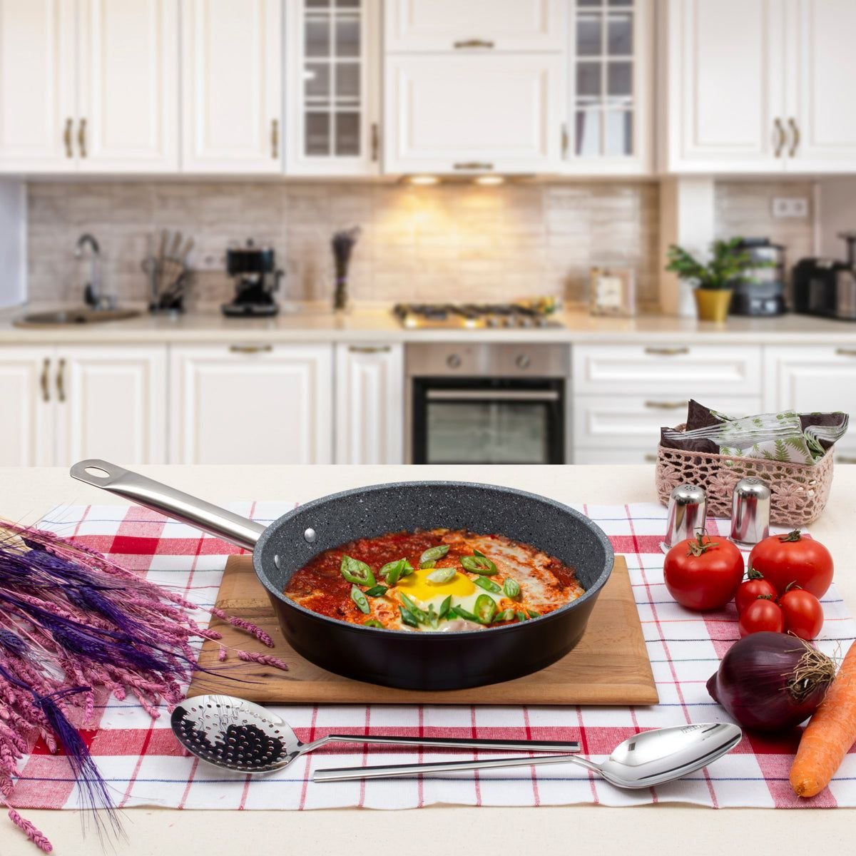 SERENK NON STICK PAN: Serenk fry pan is manufactured with a very long-lasting PFOA-free granite coating. The secret of tasty and healthy cooking comes from the fact that Serenk does not mix anything else with natural falovours. Steel handles designed with a safe connection to be tight for all time.
