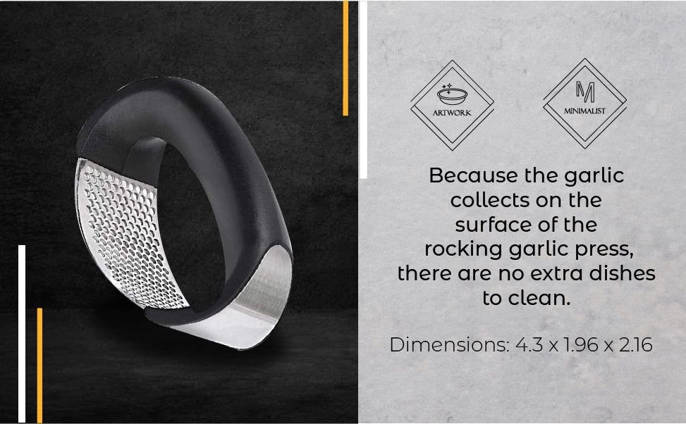 NEW INNOVATIVE ROCKING GARLIC PRESS. This new garlic press with an arc shape and comfortable handle design make squeezing a breeze; even for those with weaker grip or small hands.