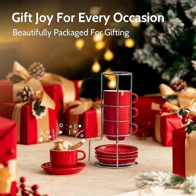 Home > Sweese 4 Ounce Porcelain Stackable Espresso Cups With Saucers And Metal Stand Set Of 4, Red