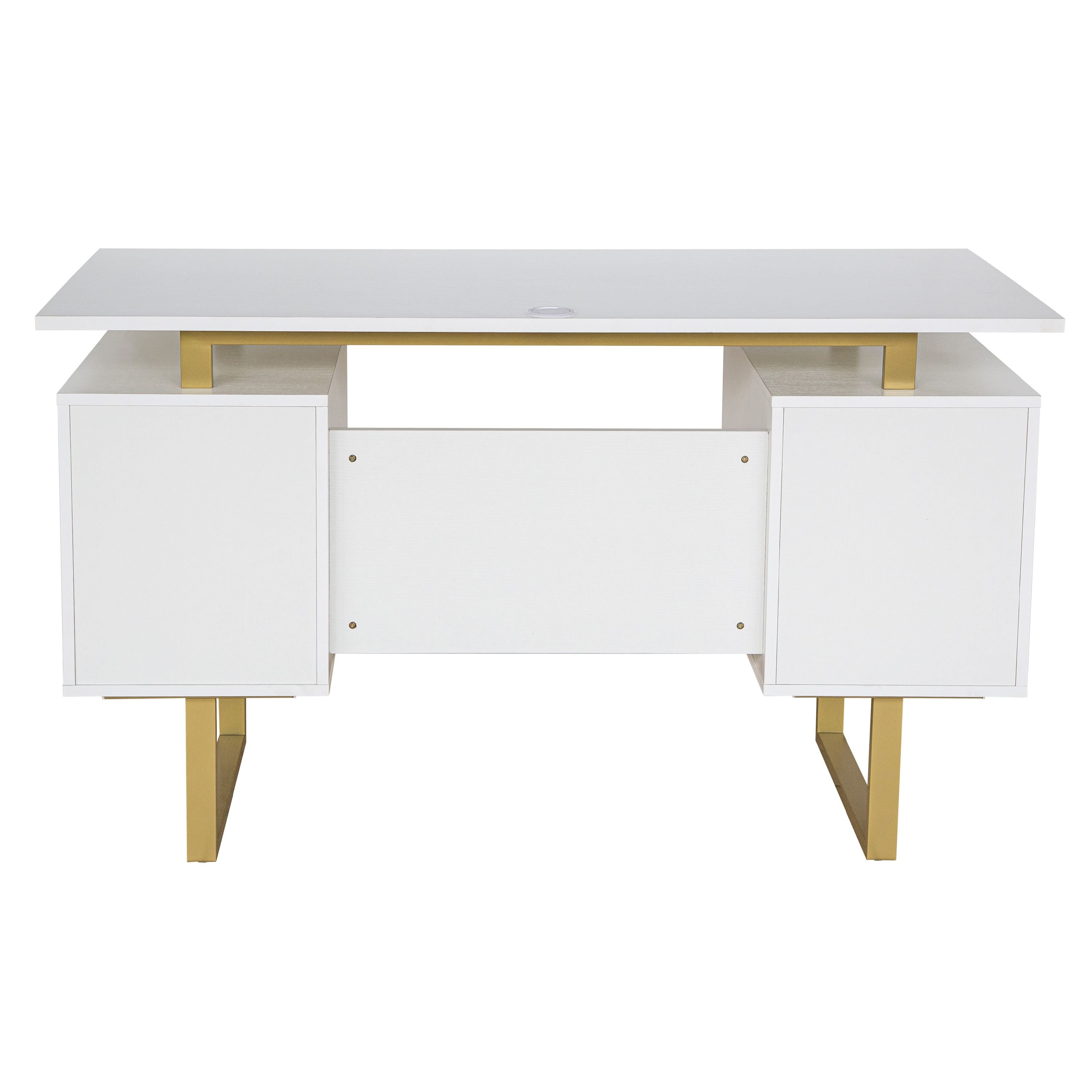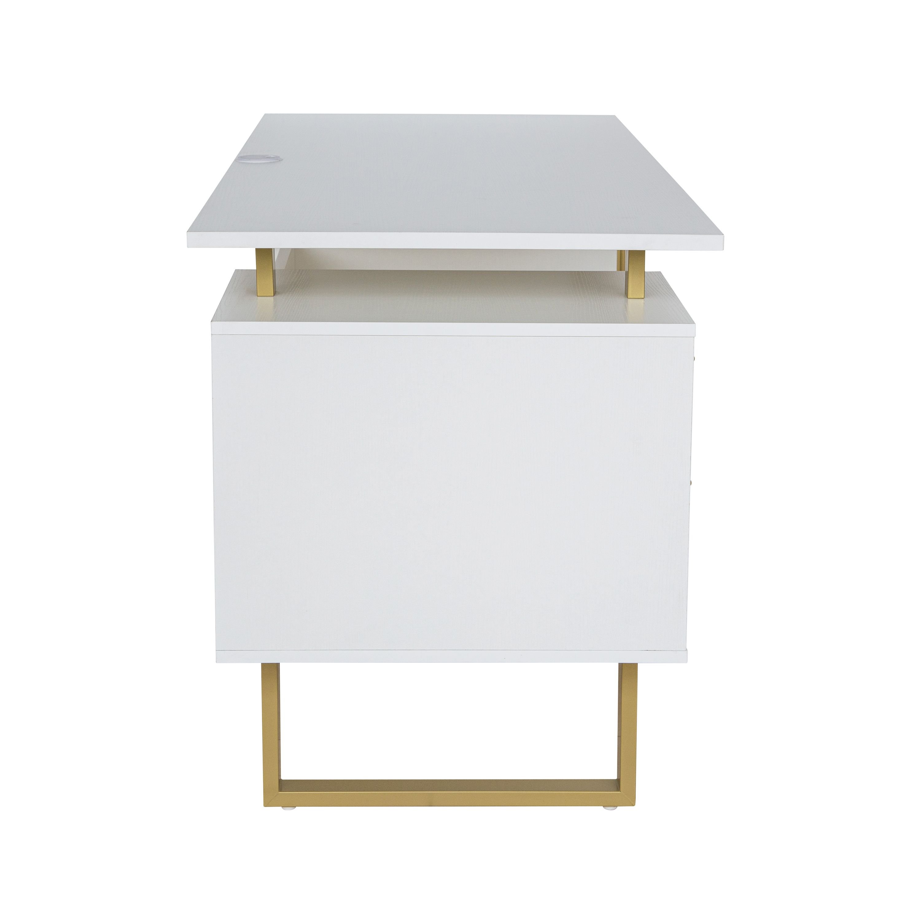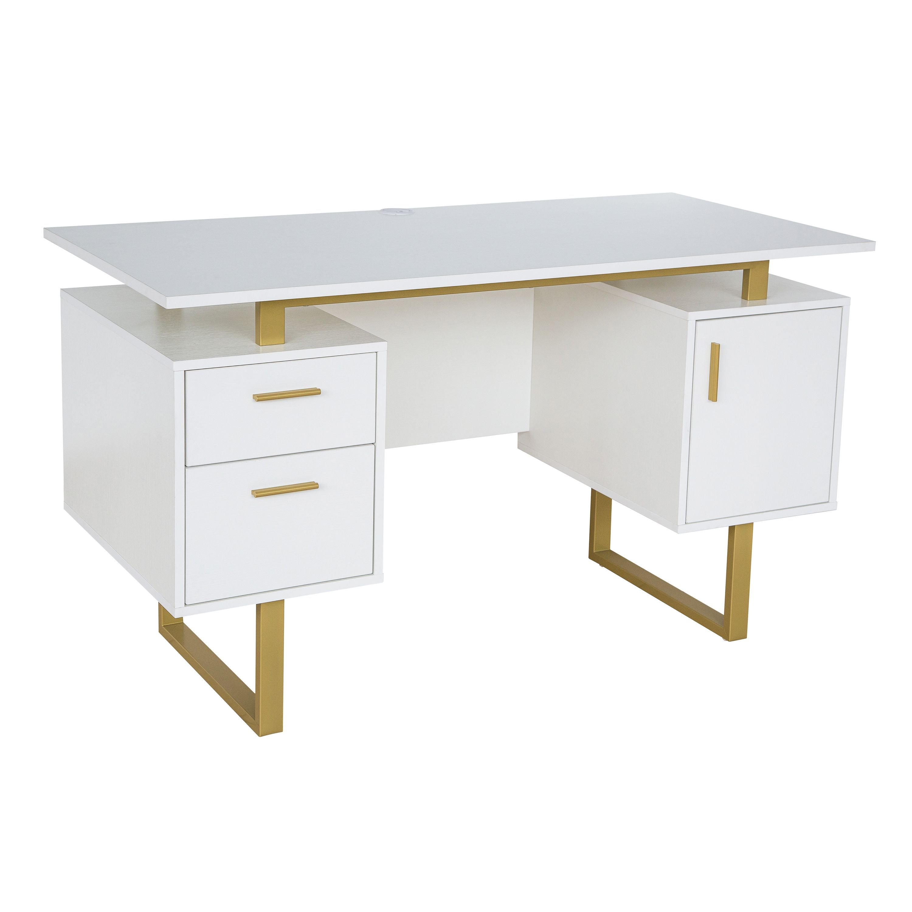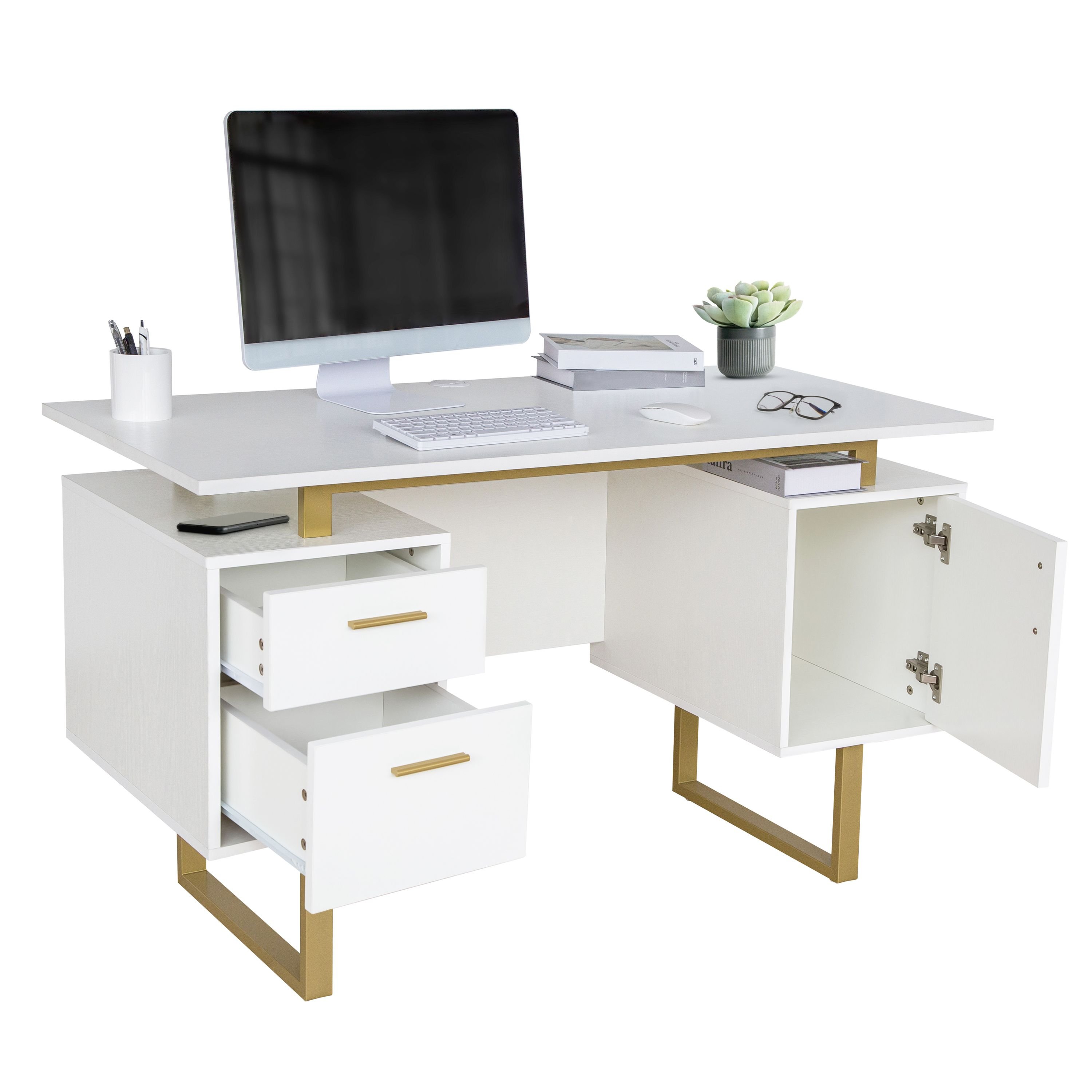 Techni Mobili White and Gold Desk for Office with Drawers & Storage, 51.25 in. WAesthetically pleasing with clean lines, a large floating top, and gold metal track legs our white and gold computer desk with drawers and storage cabinet embodies the perfect combination of function, durability, and design in modern form. With its gold metal legs, this engineered wooden desk with drawers will add a touch of elegance to your office or as a bedroom desk with drawers. With its two drawers and storage cabinet, you will have ample space to keep your essentials organized and within reach. Whether you're working on a computer, tackling paperwork, or just need a desk with drawers for bedroom you'll have the space to spread out and work comfortably. No more feeling cramped or restricted as you bring your ideas to life. For added peace of mind it comes with a 5-year limited warranty. Shipped ready to assemble and easy to clean.