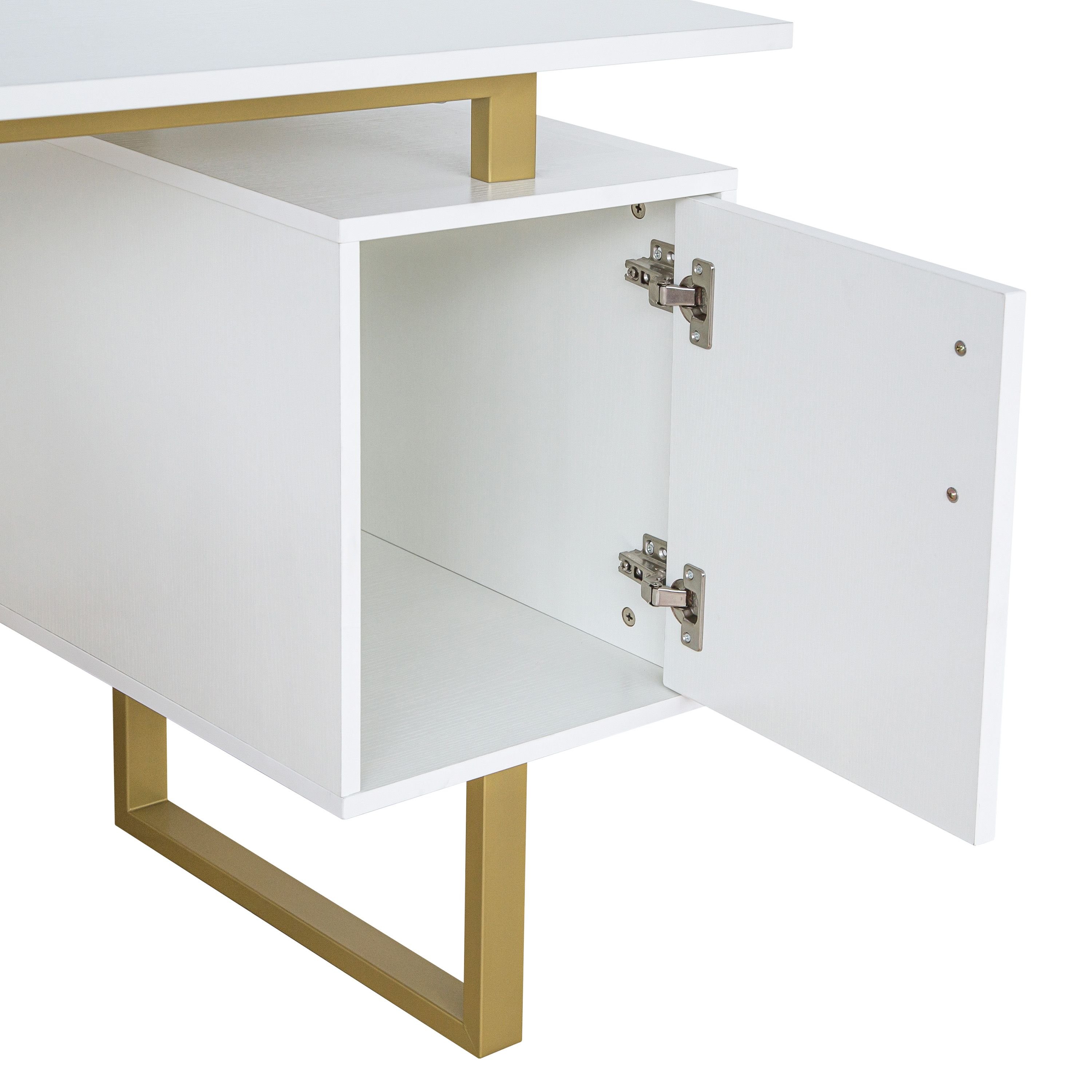 This white and gold modern desk features two siding drawers and a cabinet with gold handles, to provide functional space to keep your workspace organized.