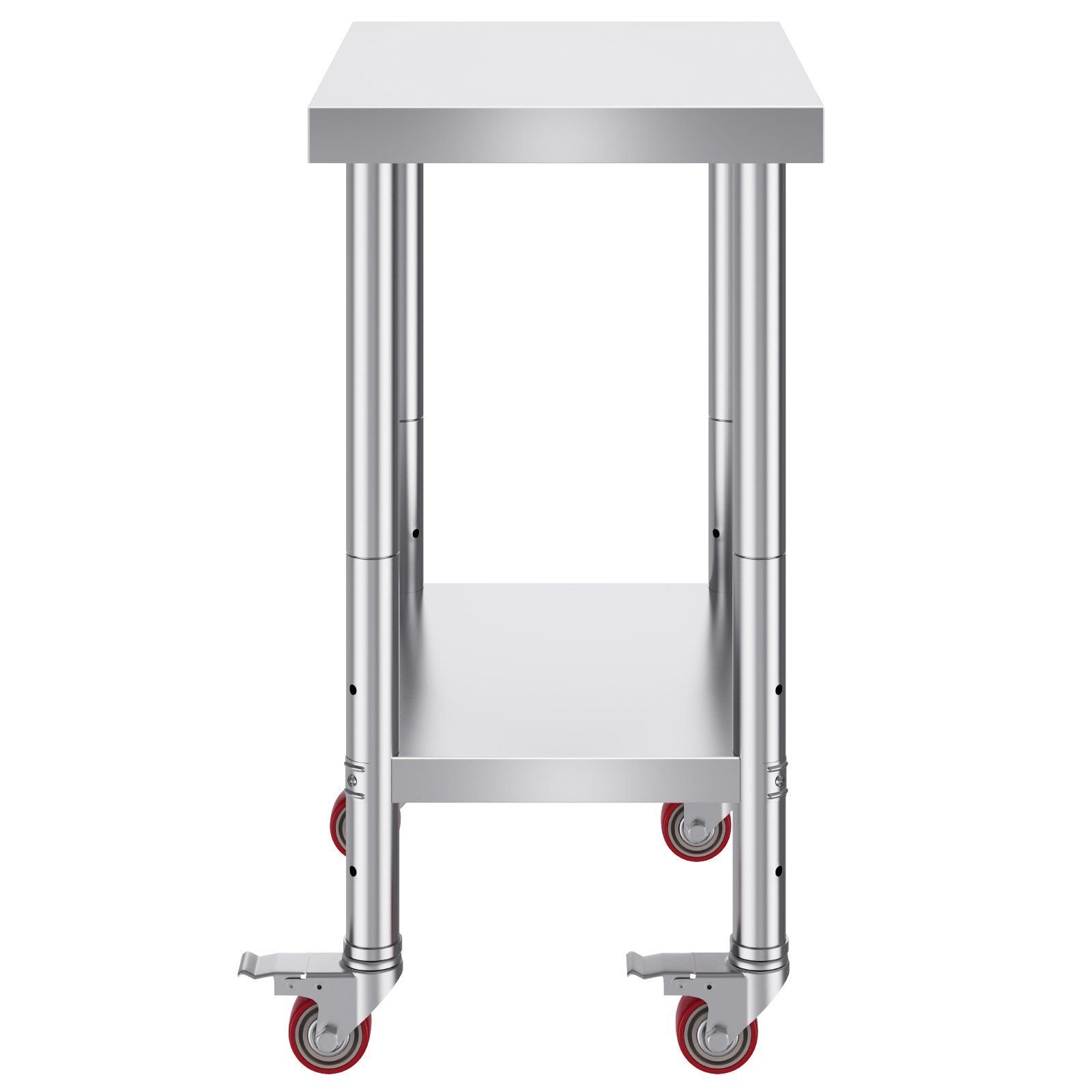 • Superior commercial work table. Constructed by durable stainless steel, corrosion, and wear-resistant; It won't deform easily. 24 x 18 x 2.2 in upper table size and 18.9 x 13 x 1.8 in undershelf provide ample storage space. 4 chaster wheels provide flexibility. You can easily change the height of the undershelf—perfect using in the kitchen, restaurant, school, or other domestic or commercial applications.