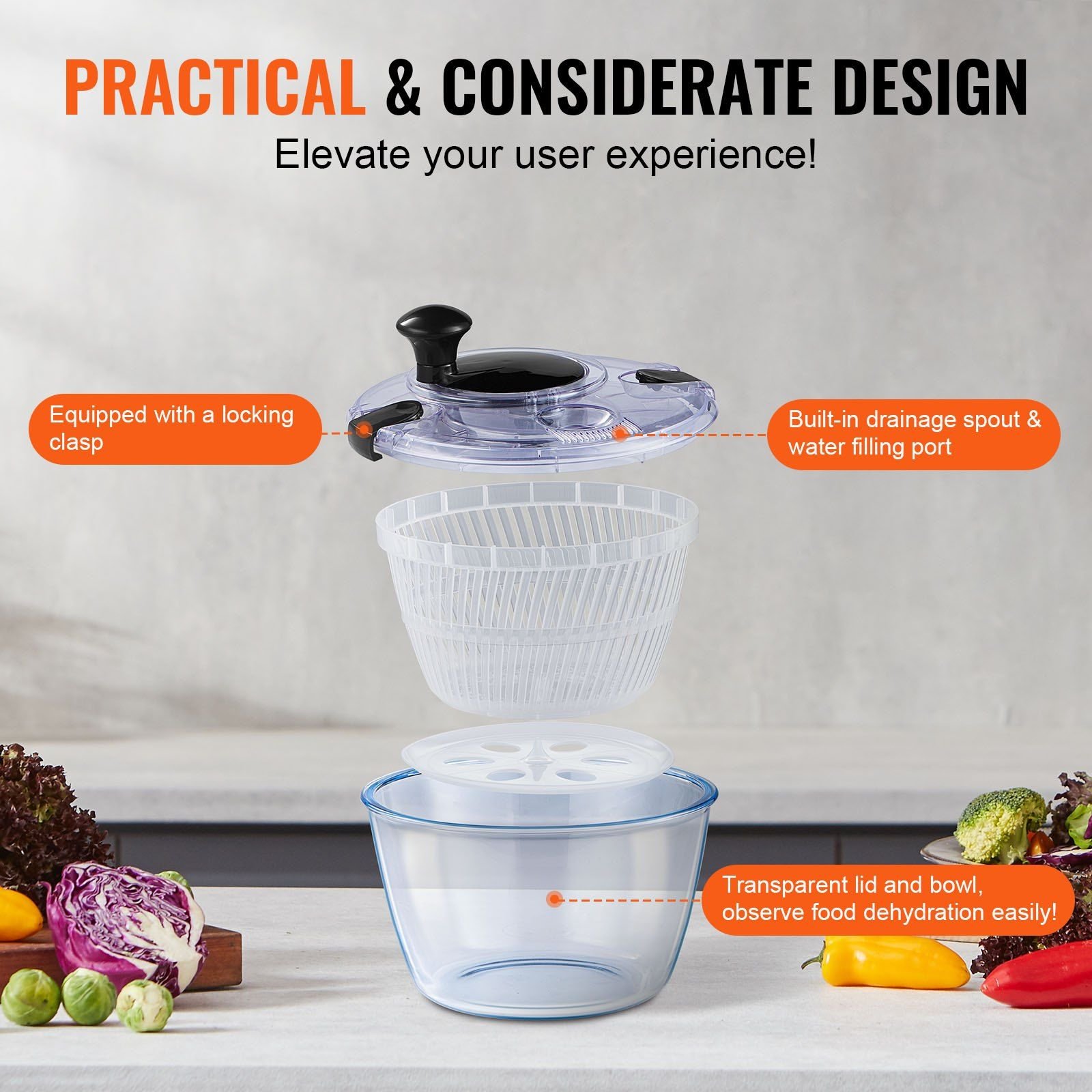 2.Effortless Cleaning Made Simple: Experience the ease of cleaning with our fruit spinner! Just wash your veggies, place them in the food basket, snap the lid shut, and give it a quick spin. For a thorough cleanup, you can easily detach the top and toss it in the dishwasher. No more scrubbing or soaking - it's a breeze to keep your vegetable spinner dryer sparkling clean.