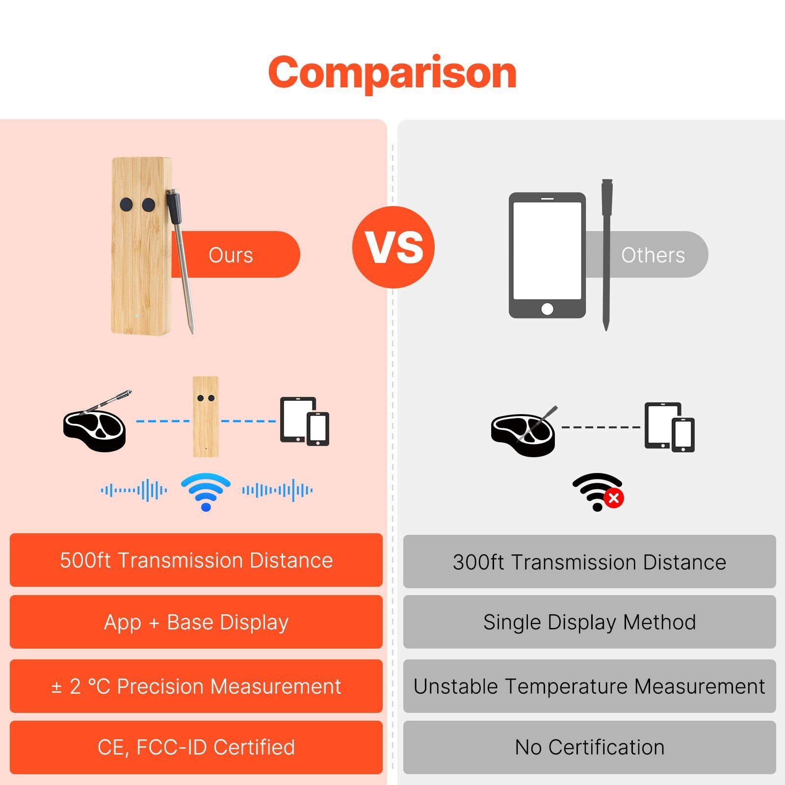 1.Long-Range Power: This wireless meat thermometer has Bluetooth 5.2 for long-range power, sending temperature updates to your phone from up to 500 ft away. There's no need to hover in the kitchen - let the thermometer keep you posted so you can adjust the cooking as needed!